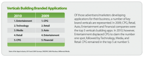 The report also mentioned the verticals that are seeing the most branded applications, and they are in line with the trends we’ve seen throughout Millennial Media’s monthly findings. Between 2009 and 2010, CPG worked its way up the chart, from the #5 spot to #1, while Entertainment fell from the top position down to #4. Retail also saw growth from last year to 2010.