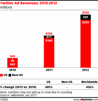 In November 2010, Pew Internet & American Life Project noted that just 8% of online Americans use Twitter service. However, eMarketer is quite optimistic that earnings of Facebook’s runner-up will reach upwards of $150 million, despite the growing competition. Further forecasts see a whopping $250 million in revenue for the year 2012, again with an assertion that Twitter will live up to the hype.