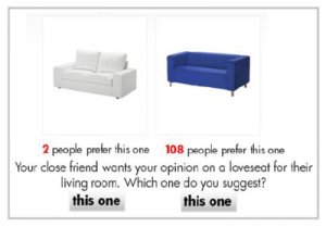 “Analysis of the resulting choices showed that receiving a small amount of social pressure to reverse one’s opinion (by being told that a just few people had chosen differently) was more likely to produce a reversed vote than when the pressure felt was much greater (i.e. where an overwhelming number of people were shown as having made a different choice).”