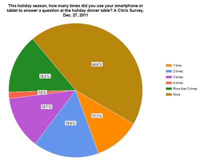 The holidays are a time for relaxation, but that can be ruined by fretting over the innumerable emails waiting for you at the office. For many, it’s better to combine the two, with a growing number of people bringing work home for the holiday season. It’s not like I check my smartphone ’round the clock to respond to every little thing. I still very much look forward to the traditional exchange of gifts, sumptuous dinners and family bonding during the holidays. Having gadgets to connect you with the office bits makes it inevitable for a person to mix a little of work while having a great time with their loved ones over the holiday break. Citrix Systems conducted a survey over the past few weeks to better understand how technology’s become a part of people’s lives over the holidays.