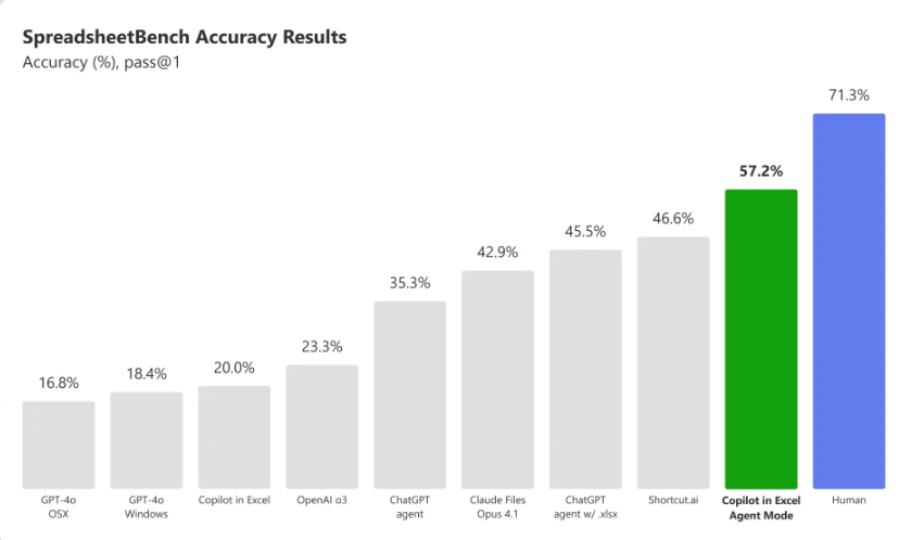 Of course, much of this could already be done with the Microsoft 365 Copilot, but Agent Mode in Excel is said to be more accessible. It’s also more accurate, Microsoft claims. In internal tests, Agent Mode achieved a score of 57.2% in Spreadsheet Bench accuracy, which compares with just 20% for the original Copilot in Excel. That makes it superior to various other AI tools, including ChatGPT Agent, Shortcut.ai, Claude Files Opus 4.1 and OpenAI o3. However, it’s notable that humans still achieve the highest score on that benchmark, at 71.3%.