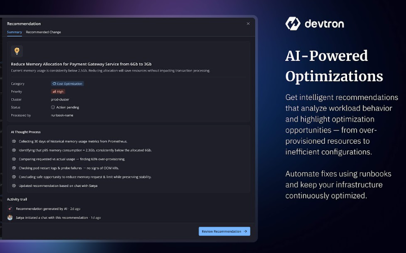 Devtron 2.0 changes that, providing truly unified visibility for Kubernetes deployments. With its new Agentic SRE, teams will be immediately alerted to an overloaded node the moment it starts slowing down, and when their compute costs suddenly spike, it’ll tell them exactly what’s causing it. Then, with a single click, they can have Agentic SRE automatically fix whatever the problem is, optimizing their nodes and resources to ensure maximum performance at predictable cost.
